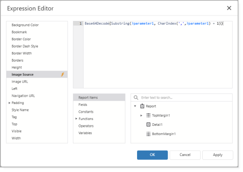 Configure the Image Source to include the function below, replacing "parameter1" with the name you assigned the parameter in step 2.