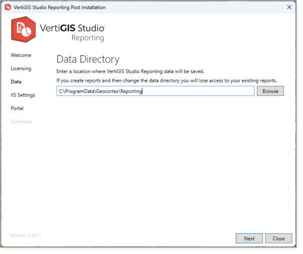 2. Enter the path to the data directory. Alternatively, if the data directory is on the same machine as VertiGIS Studio Reporting, click Browse to browse to the data directory.